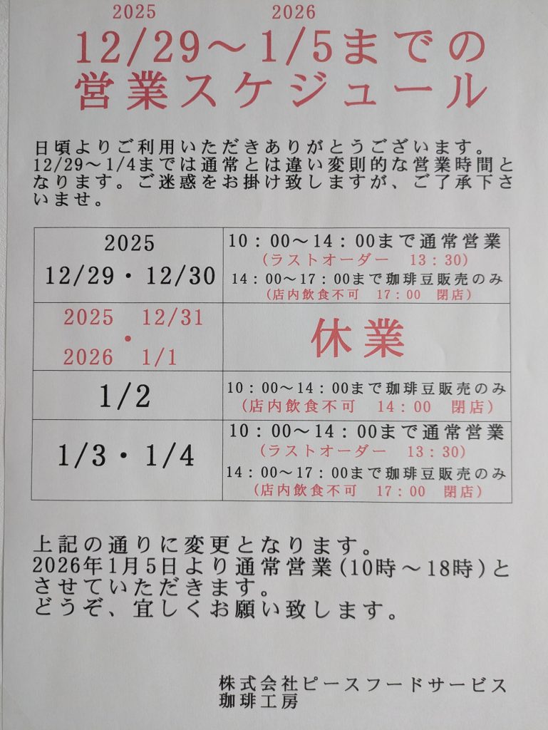 2025.12.13 珈琲工房 12/29~1/5までの営業時間変更のお知らせ 平素より当店をご愛顧頂き、誠に有難う御座います。 12/29~1/4までは通常の営業とは異なり、変則的な営業時間になります。ご迷惑をお掛け致しますが、ご了承下さい。 ご確認の程、宜しくお願い致します。
